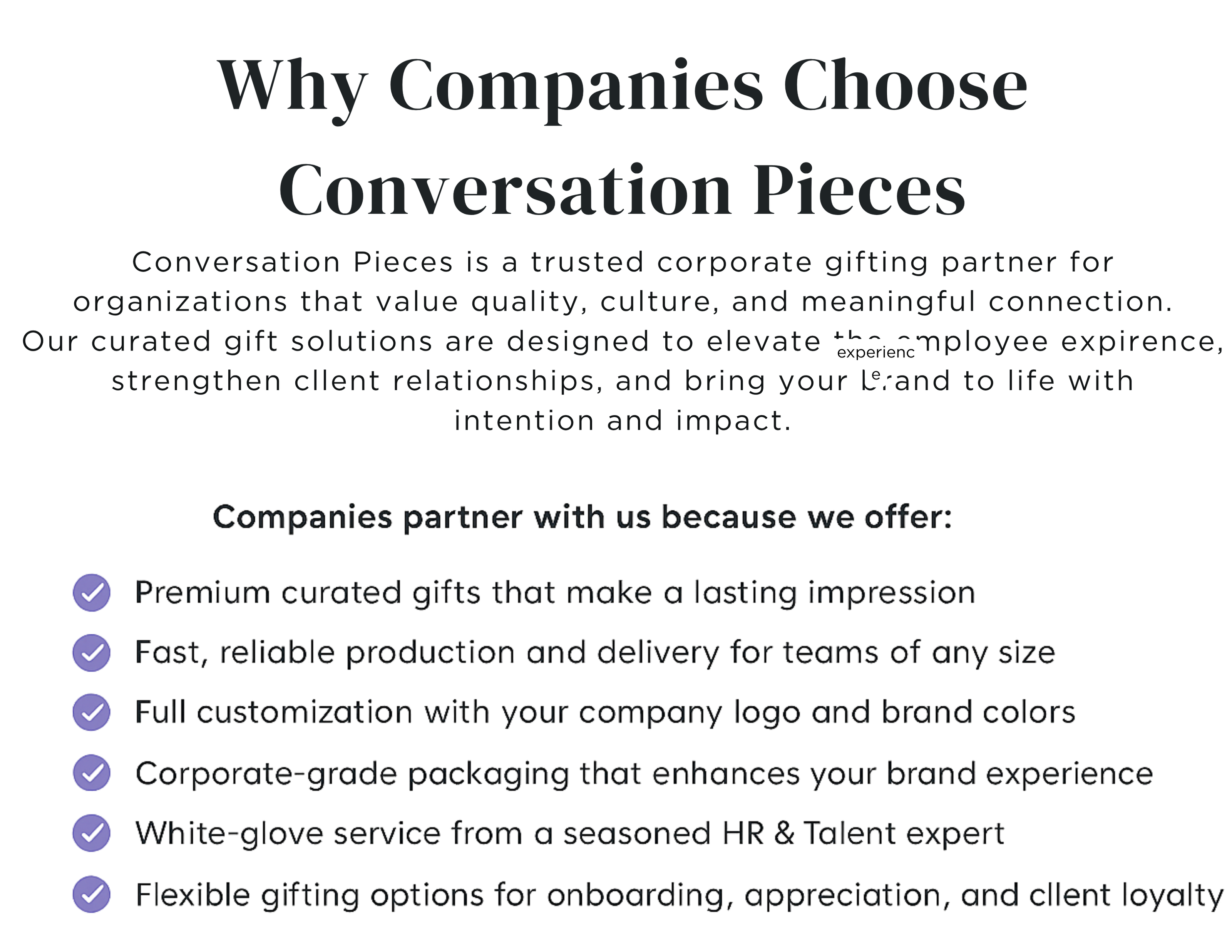 At Conversation Pieces, we make corporate gifting effortless from start to finish. Our consultative approach ensures every detail — from concept to delivery — reflects your company’s brand, values, and purpose. We partner with HR, marketing, and business leaders to curate premium, branded gifts that drive engagement, loyalty, and appreciation.